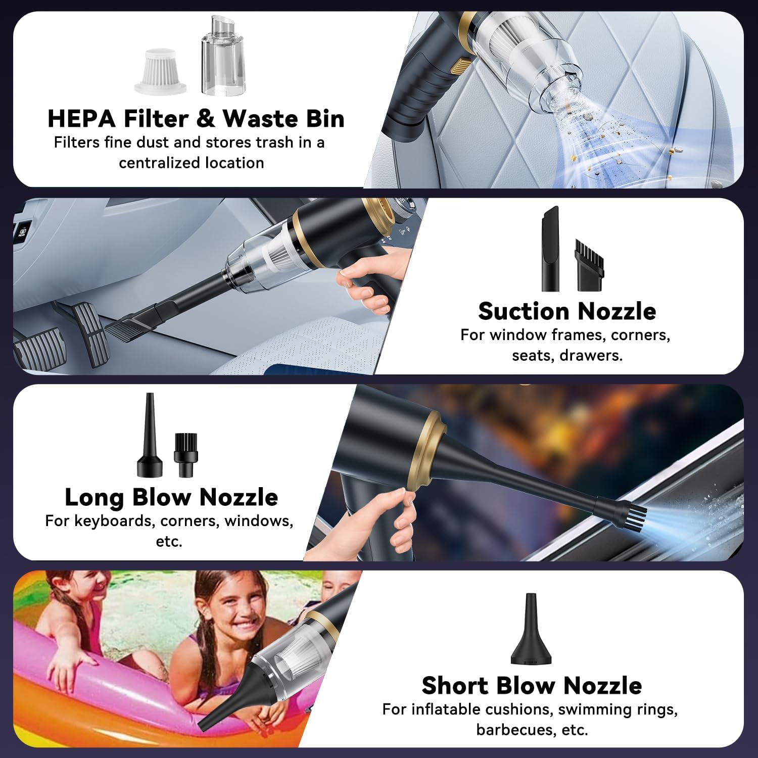 - Conception multifonctionnelle 4 en 1 : elle intègre un aspirateur, une pompe à air, un dépoussiéreur à air et un ventilateur, et fournit diverses buses. En camping, vous pouvez sortir ce mini aspirateur de la voiture pour gonfler le matelas pneumatique, l'anneau de natation et les jouets gonflables, et il peut également être utilisé comme ventilateur lors de barbecues à l'extérieur