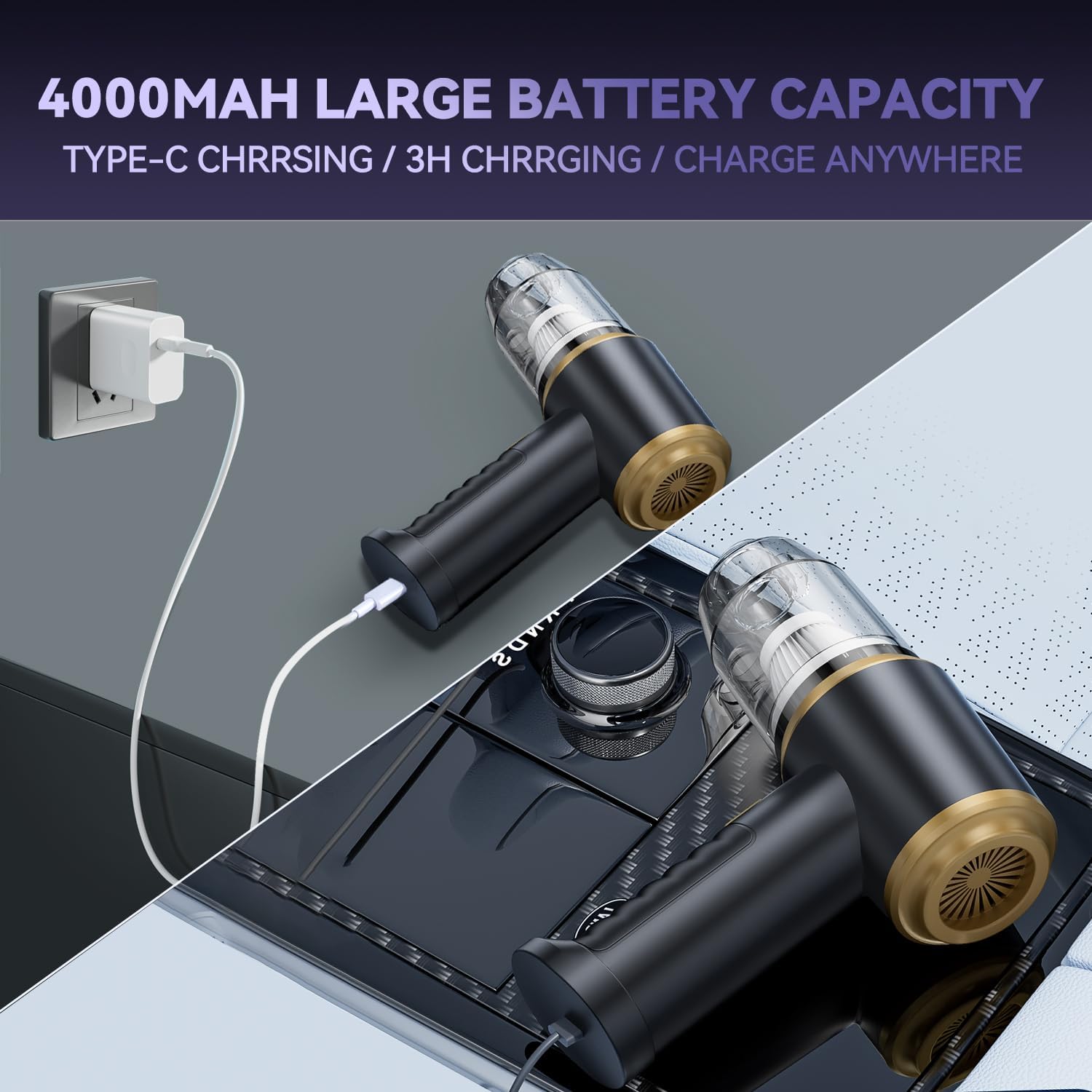 - Batterie rechargeable et charge TYPE-C : Ce mini aspirateur est alimenté par une batterie de 4 000 mAh, qui prend en charge la charge de type C. Il peut être complètement chargé rapidement en 3 heures et peut être utilisé pendant près de 25 minutes.