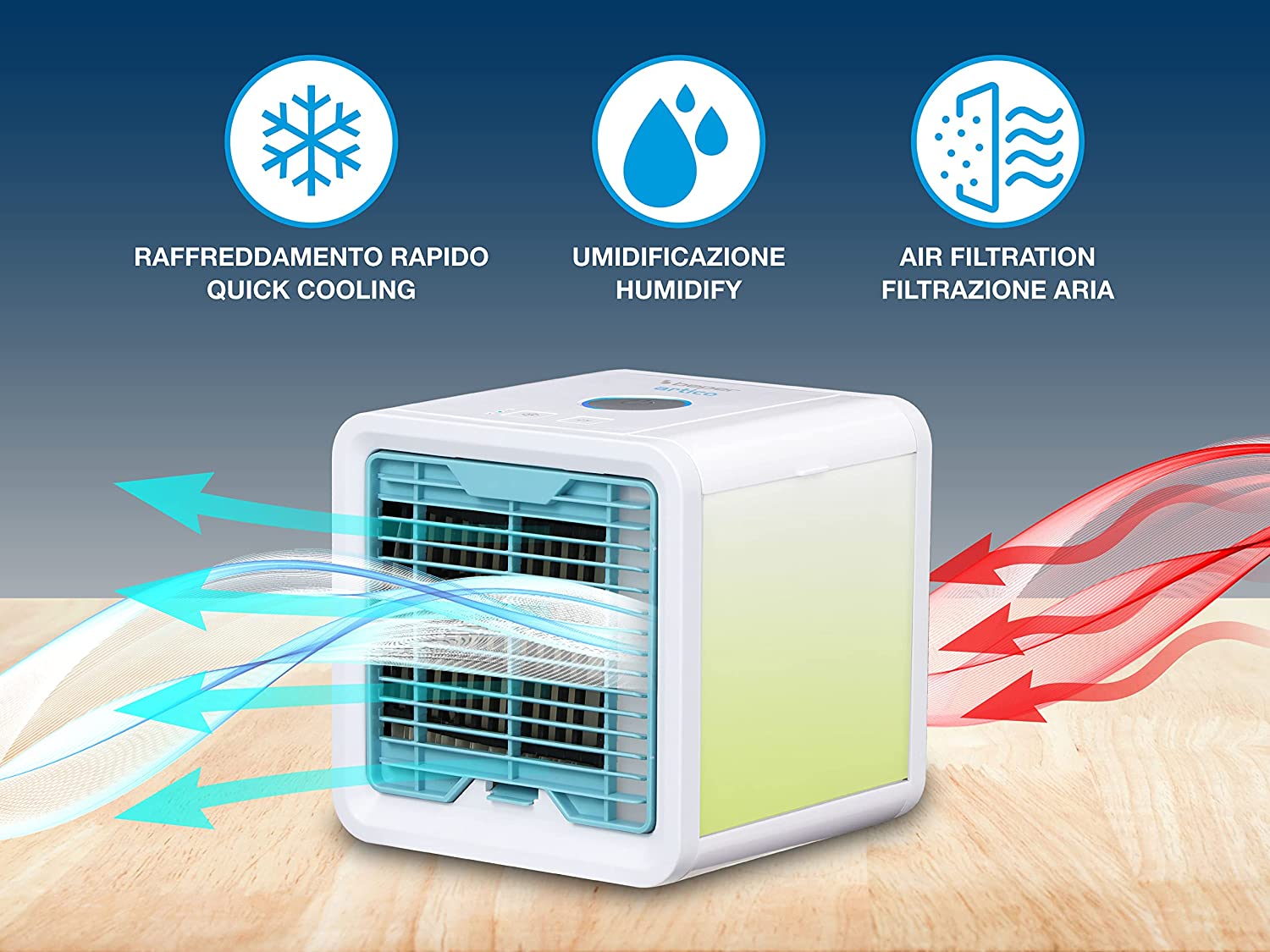 Triple Menace Contre la Chaleur: Le Cool Air Mini Climatiseur ne se contente pas de refroidir. Il agit également comme un ventilateur et un humidificateur, créant ainsi un environnement confortable et rafraîchissant, où que vous soyez. Ajoutez simplement de l'eau froide ou un glaçon dans le réservoir pour profiter de votre été au frais.