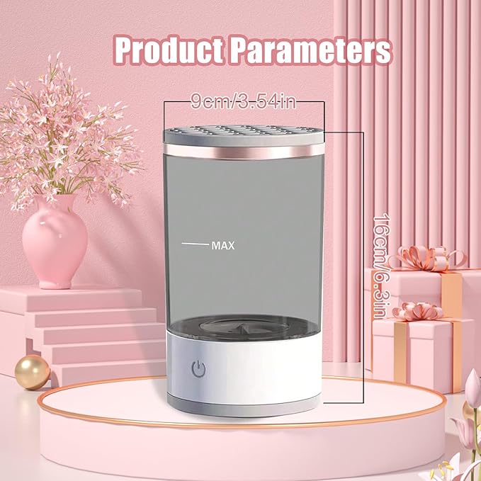 -Corps visible : le nettoyant est conçu avec un corps visuel noir semi-transparent, ce qui permet à l'utilisateur d'observer le processus de l'objet à travers le corps. Le nettoyeur a une vitesse de rotation de 7000 tr/min pour garantir que les résidus cosmétiques sur les pinceaux de maquillage sans endommager la forme et la douceur des poils.