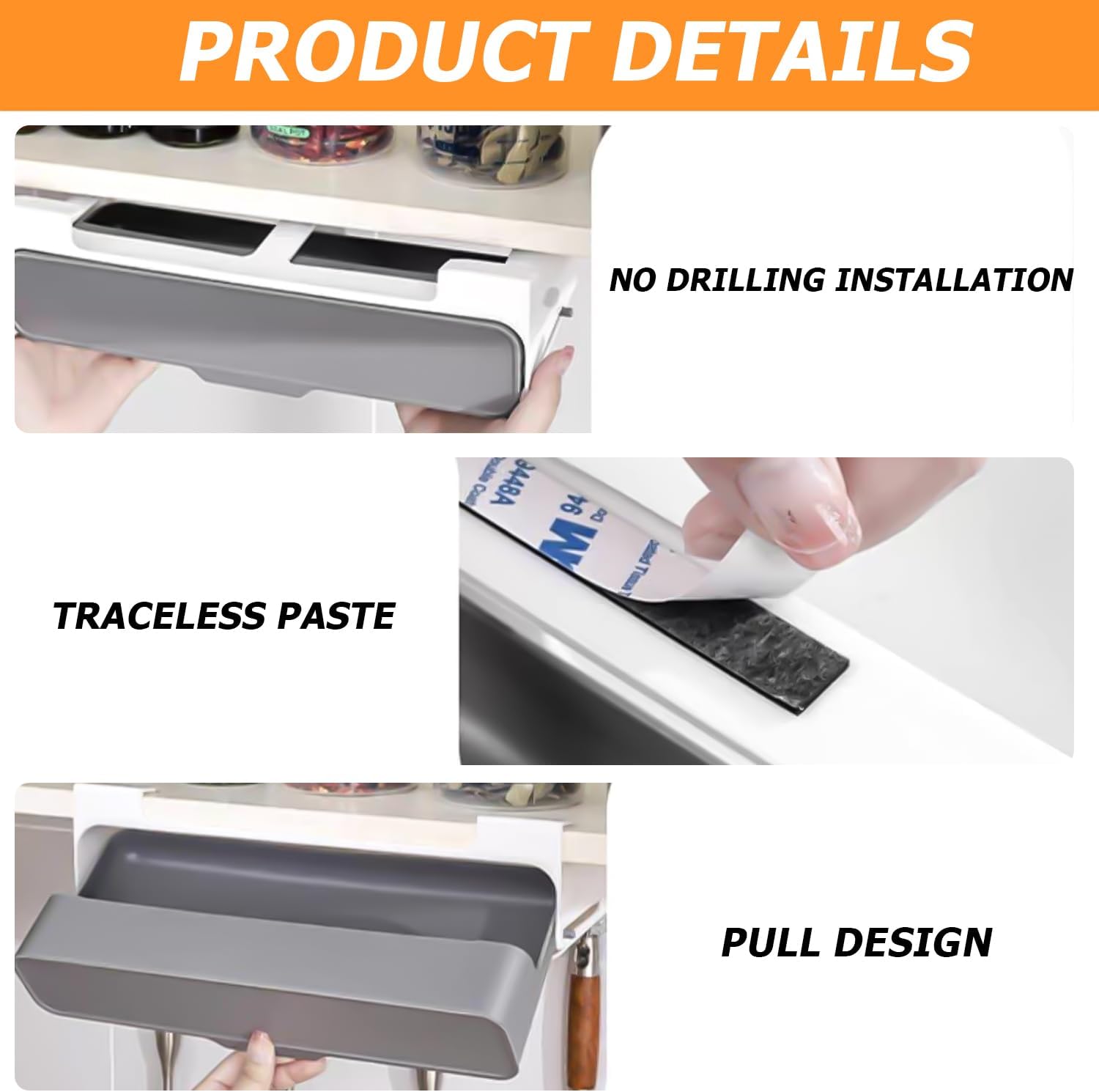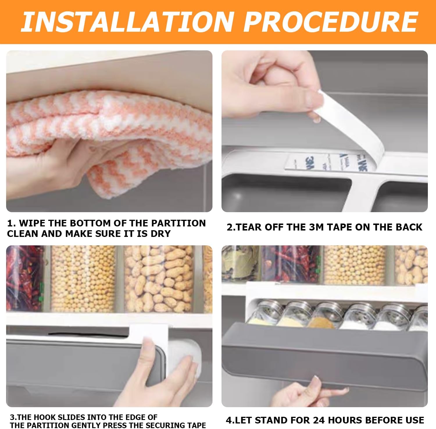 L'installation de ce rangement à épices est un jeu d'enfant. Grâce au ruban adhésif VHB de 3M inclus, vous pouvez fixer solidement l'unité sous votre étagère sans aucun perçage. Cette méthode non-invasive préserve l'intégrité de vos meubles tout en offrant une stabilité à toute épreuve. Une fois installé, le compartiment coulissant vous permet d'accéder facilement à vos épices, rendant la préparation des repas plus fluide et agréable.