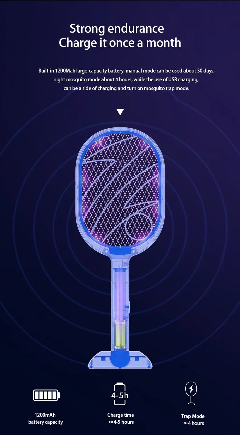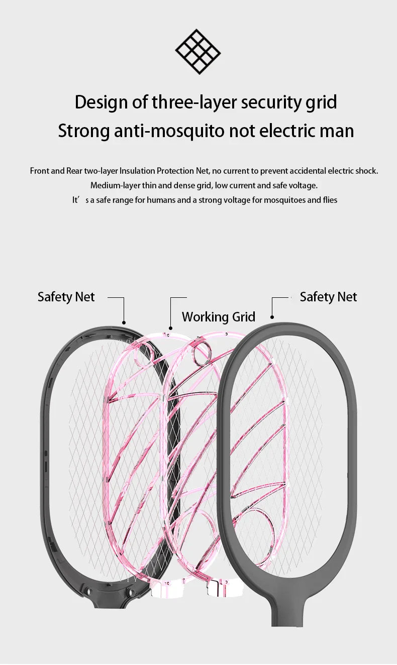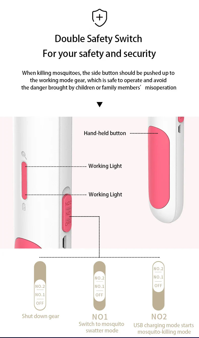 Facile à utiliser. Il suffit d'appuyer sur le bouton latéral en mode fonctionnement. Appuyez en même temps sur le grand bouton pour allumer le réseau électrique et tuer les moustiques.